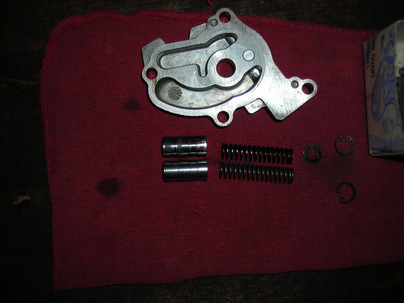Here is the oil pump, which was my next target. From the OC and HOW record, it seems the pressure pump relief spring can wear out, and I've read something about a piston update. I bought a new spring and piston. Here they are: