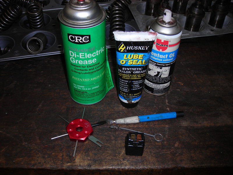 What we have is (L to R) a can of dielectric grease, a tube of much thicker and sticky dielectric grease, a can of contact cleaner (specially intended for improving conductivity), bottom left, a tool for removing connectors from multi-plugs, and some small wire brushes for cleaning terminals.