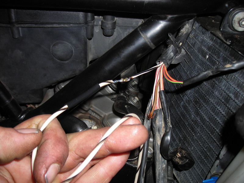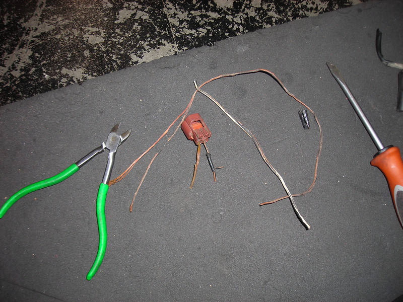 Since the plug was melted and the insulation burned off all the way into the plug, I crimped two small terminals on that would fit the small pins on the temperature sender. I ran an extra length of wire so that I could put a manual fan switch in, but ran out of energy before I could decide on where to mount the switch.
