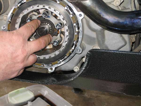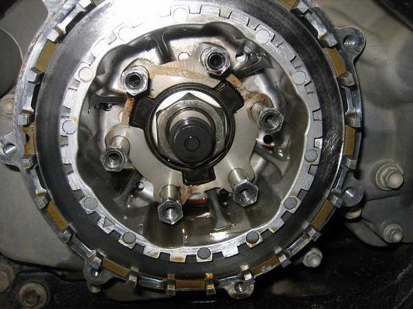 Took the opportunity to check the clutch discs. They all looked fine except for one side of one friction disc (3rd from back) was blackened and worn. Mating metal disc was fine, so nothing to do but clean, oil and put it back in.