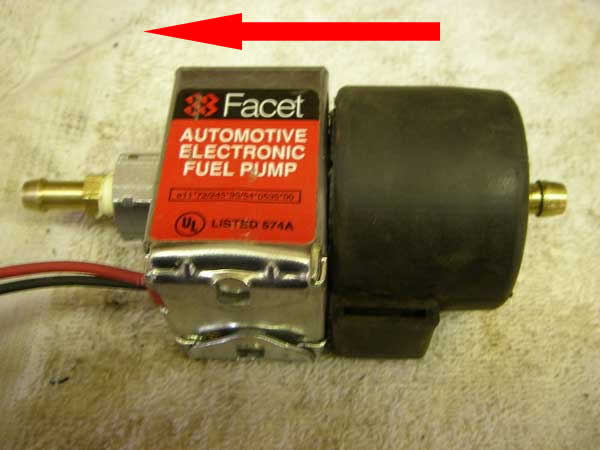 I wrapped closed cell neoprene around the input check valve on the 40171 and installed the OEM rubber mount in the position shown below. Also note that the metal mounting tabs on the pump need to be removed or bent out of the way, as shown here. Direction of fuel flow is as the red arrow shows. It is well marked on the pump itself.