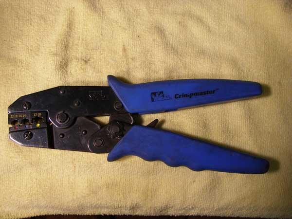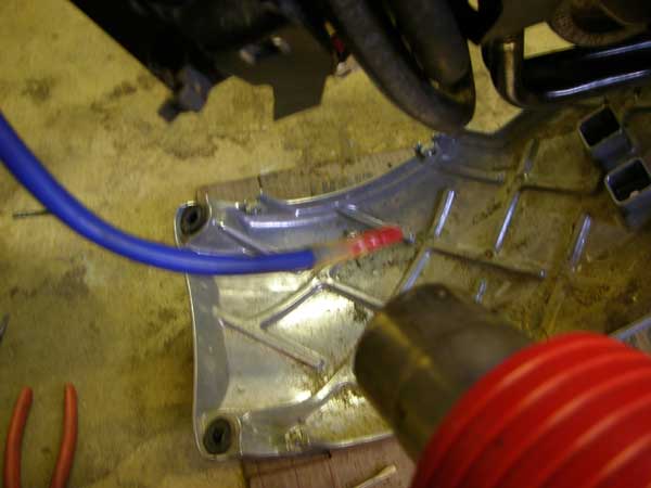Attach the proper female spade connector to the blue-black wire in the original wire harness (the one you cut earlier). Use high quality crimp connectors (this one comes with shrink tubing pre-installed) and a good crimping tool. I used a convenient engine case bolt for the ground lug but you could use the brown wire in the loom if you preferred