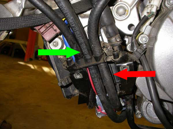 Tidy up your hoses and secure as needed with zip ties. The red arrow points to the OEM fuel line that carries pressurized fuel from the output of the pump to the carburetors. The green arrow points to the new 5'16" fuel line that carries non-pressurized fuel from the left tank shutoff to the inlet of the pump.