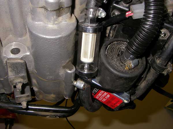 Note: a fuel filter in the input line to these kind of pumps is MANDATORY, as they are not tolerant to any crud in the fuel. Facet suggests a 74 micron filter. Most automotive filters aren't marked with their filtering media size, so do as I did and get the best you can find and change it often. I like the clear, so I can visualize the contamination it has removed. This one also has replaceable elements, so I can carry a bunch with me on a trip in the same space as one whole filter takes.