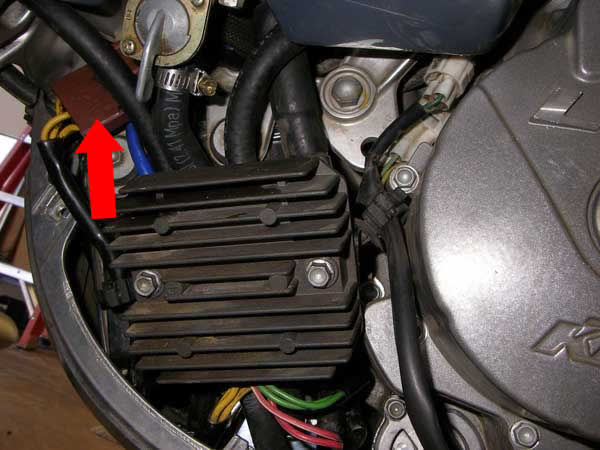 Connect the new input fuel line to the shutoff valve, and re-install the VRR. Help your VRR live by spreading some heatsink paste on the mounting bracket to VRR surface first. While you're down there, check the VRR to Stator connector (the brown one the red arrow points to in the image below). They are subject to corrosion and many times they will melt due to high resistance between the contacts. Disassemble as needed and clean the contacts thoroughly, then pack with high temperature dielectric grease. I check this connector at each oil change.