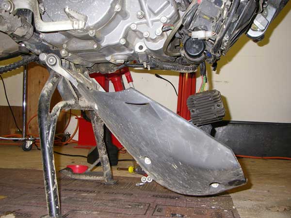 With all that out of the way, it's time to get dirty. First remove the two bolts holding the front of the skidplate with a 10 mm socket. 3/8" inch drive is best here as the bolts are "loctite'd", and let it hinge down as shown. Also, it is easier to access the fuel line with the voltage rectifier/regulator (VRR) dismounted. Two bolts with an 8mm socket.