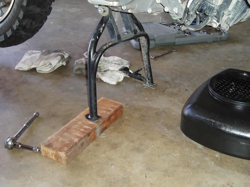 One tip given to me by Rider914 was to place a 2x4 under one side of the center stand this will allow a lot more of the oil to drain from your tank and filter area.