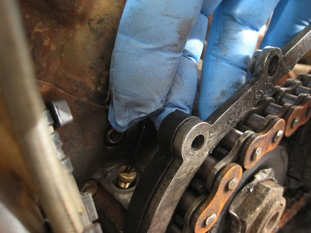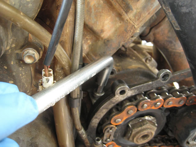 At this point, you might like to put the allen bolt back in place (sans the oil jet), turn the motor on and give the gas a few blips to clear any debris that might be in the hole... You should put the bike in neutral before you start it, since it will not go into neutral with the motor running without the oil jet in place....