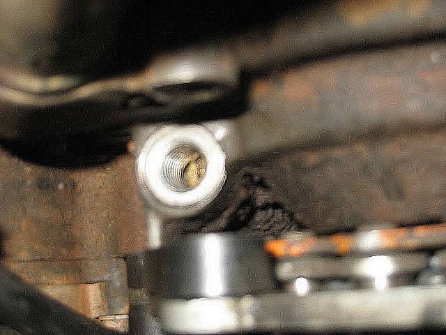 Next, it is a bad picture, but you can see the oil jet in the hole so you get an idea how it should look like... It's easier to see with the left side fuel tank off, but it is not necessary to remove it in order to clean the oil jet. If you clean the jet when you check the valves, you'll have the tank off the bike anyway.