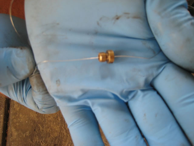 A bobby pin (with the round ends cut off) and a guitar string... The one pictured above is 0.08 mm thick. The (very tiny) hole in the jet is 0.30 mm, which means that any string will fit in there as long as it is smaller in diameter (for example 0.10 mm, 0.12 mm, 0.20mm) just use what you can get your hands on.