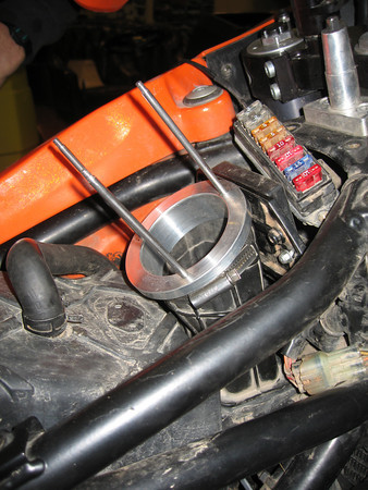 Side view with tank off.... you'll notive I had to relocate the CDI unit about 1" lower to make use of wated space and allow the maximum depth filter to be fitted. Also, you will see that the actual water access level / submersible level is exactly the same as with the stock snokel.