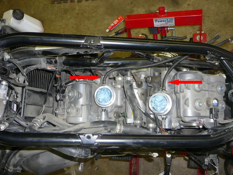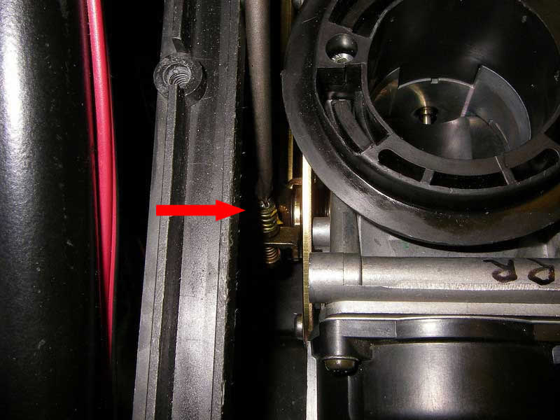 To start with, remove the glove box, air box cover and air cleaner element. The fuel tanks need not be removed for this procedure (if you have previously routed the vacuum hoses to an easily accessible area or are using an STE Flowmeter). The arrow points to the screw you turn to sync the carbs. Its on the left of the rear carb as you face the front of the bike. You should be looking at something like the above photo.