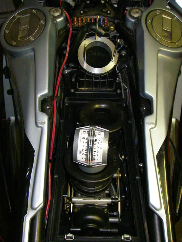 Another option is a direct airflow meter like the STE Flowmeter shown above which measures the actual airflow though carbs or F.I. throttle bodies. The correct model for the 950/990 is the 6537 AKA the "SK". It fits snuggly in the air horn and doesn't need to be held in place (though if you touch your finger to it lightly, it will make reading the gauge easier with the "normal" V-Twin engine vibes). It's the most accurate and easiest to use tool of the bunch, as no vacuum connection is needed. Click on the image above for a link to more info on this tool.