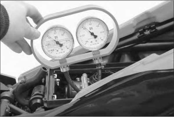 – Connect both dial gauges to one cylinder with the vacuum hoses and