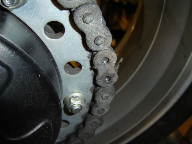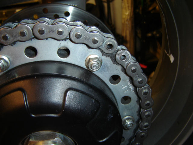 Last, you'll want to adjust your chain according to your bikes manual, and lube the chain lightly. On O-ring chains, your lube provides cushion between the sprockets and the chain and protects the o-rings from o-zone, UV rays and other stuff. Also remember to lube your chain about every 500 miles or so, and to clean your chain with kerosene every 3000 miles or so for maximum chain life.