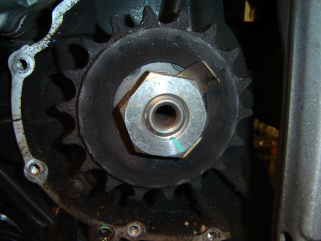 At this point, I like to remove my countershaft (front sprocket) cover and clean the chain gunk that collects under there. You'll be amazed how much crap can build up there and you'll bike will have a greater weight savings from removing all that gunk than a titanium exhaust system. Removing the countershaft cover is a good chance to inspect your front sprocket. The smaller front sprocket will wear faster than the larger rear sprocket.