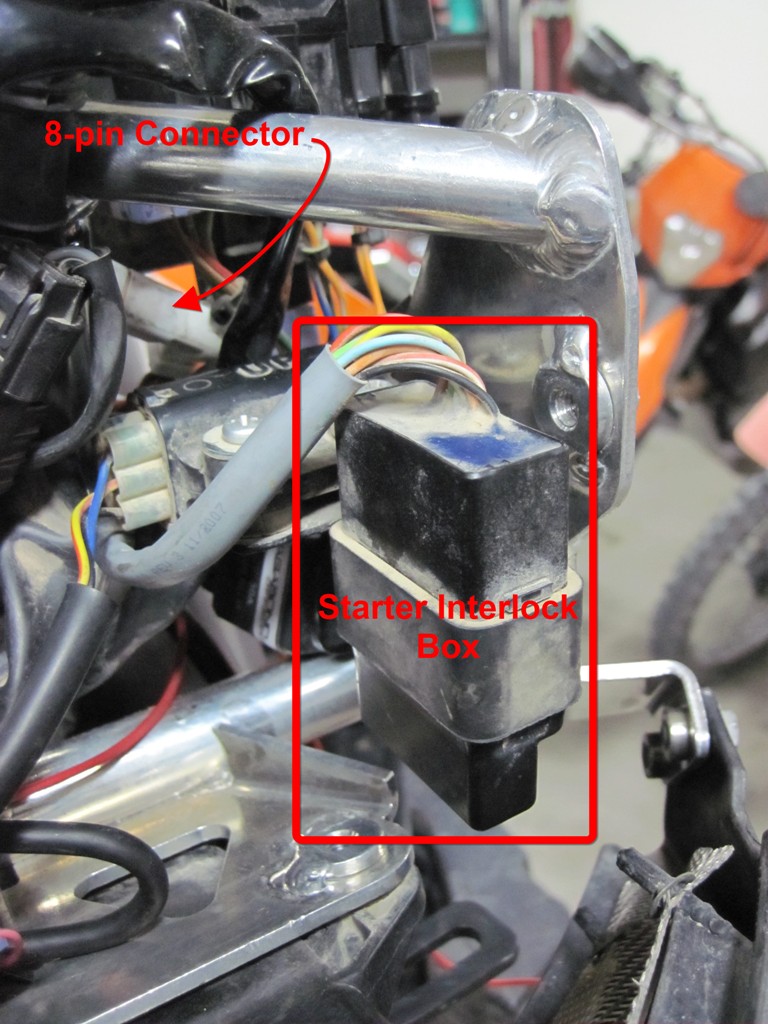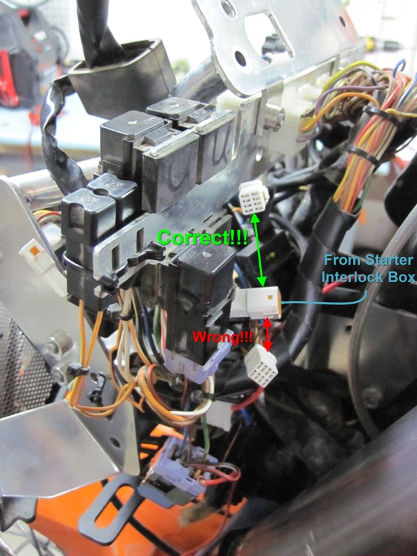So, as anticipated, the problem was very simple: the small, 8-pin connector for the "Starter Interlock" box is IDENTICAL to the one for the ABS light and dash-mounted switch. I had them transposed, as due to harness lengths it appeared to me that they could not have been made that long to go their "correct locations". I made this assembly mistake three times in a row during this whole troubleshooting operation.