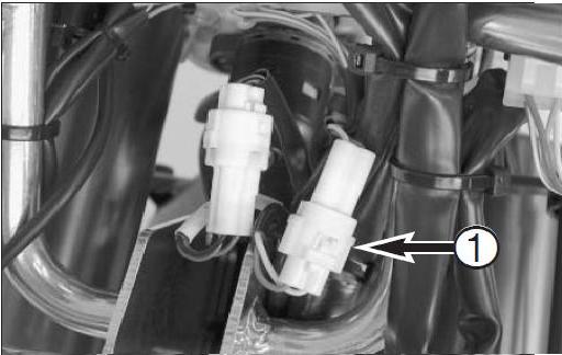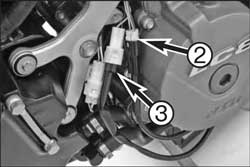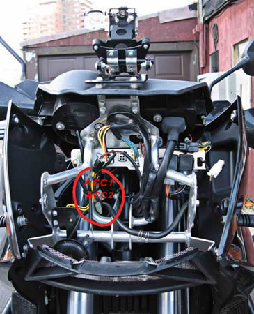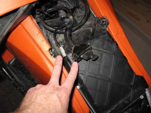 Alarm System: There are two connectors near the top of the airbox on 990 Adventures. One is a small (white) two conductor plug that connects to a switch for the glovebox lid, and a larger dark brown or black 14 conductor connector that plugs into the alarm module if you have one. If the bike isn't equpped with the optional alarm, it will have a dummy plug in the big connector and the small white connector will be empty (as shown in the image below).
