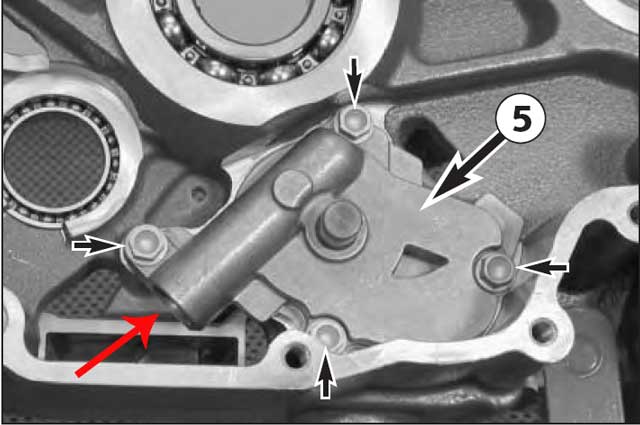 4. passes through filter (hopefully) and into distribution system that goes to crank first, then across to the other side. Also up to the heads and this is where the pressure sensor is... (back of the front cylinder, just behind the cam chain tunnel).